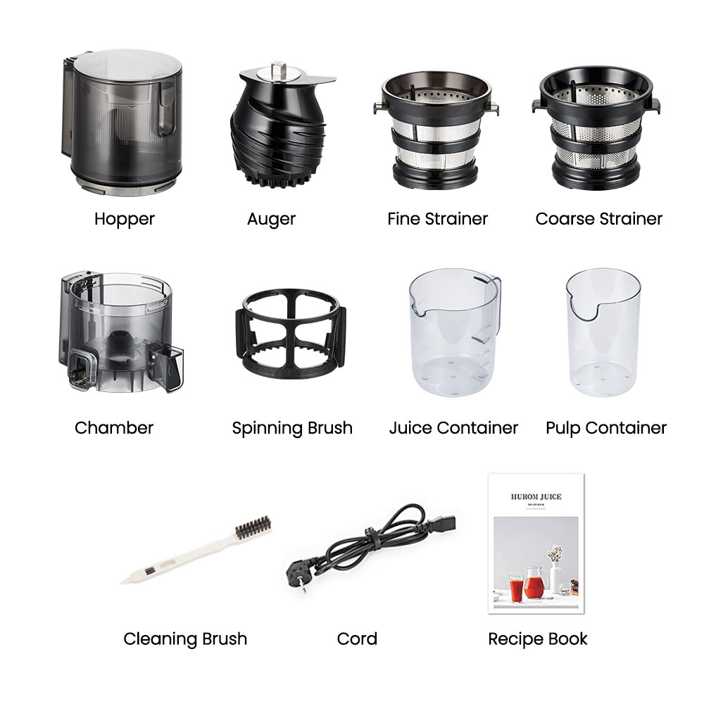 Hurom E30ST Slow Juicer Gerät, Zwei verschiedene Siebeinsätze (fein & grob), Smart Hopper Einfülltrichter, Saftbehälter, Tresterbehälter, Reinigungsbürsten, Bedienungsanleitung & Rezeptbuch