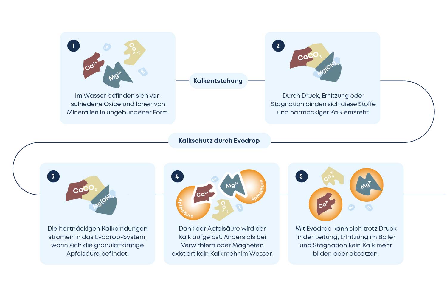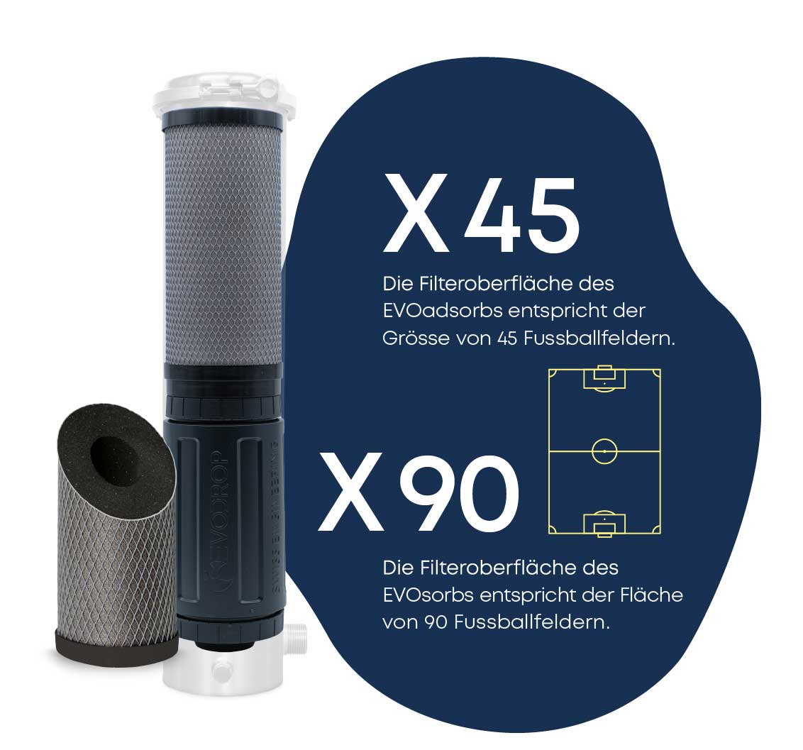 Die verbauten Carbonfasern basieren auf "Rayon" respektive sogenannter Holzfaser. Der EVOadsorb ist im Gegensatz zu herkömmlichen Filtersystemen (Pulver- oder Granulatform) membranartig aufgebaut. Diese Verfahrenstechnik verfügt bis zu 60% mehr Mikroporen. Die Filtrationsoberfläche entspricht 150 Fussballfeldern! Die Stoffe werden bis 2 Nanometer ohne einen Durchflussverlust tiefenrein gefiltert und es wird eine marktführende Filtration gewährleistet. Im Vergleich zur EVOdescale Patrone, reduziert die EVOadsorb Patrone bis zu 85% des Kalkes im Wasser. Das Prinzip des Kalkschutzes basiert auf einer innovativen Ionensiebtechnologie. Diese besteht aus lebensmittelechten Aminosäuren, welche bei der EVOadsorb bis zu 85% des Kalkgehaltes im Wasser eliminieren kann, ohne den Einsatz von Salz, Abwasser oder Strom! Der Kalk wird nicht, wie bei Verwirblern, Impfkristallen oder Magnetismus umgewandelt, sondern wahrhaftig aufgelöst. Damit kann der aufgelöste Kalk in der Filterkartusche aufgefangen und zurückgehalten werden. Alle wasserführenden Geräte, inklusive der Rohrleitungen, werden nachhaltig vor Verstopfungen bzw. Verschleiß durch Kalk oder Verkeimung geschützt. Damit erhöht sich die Lebensdauer signifikant!
