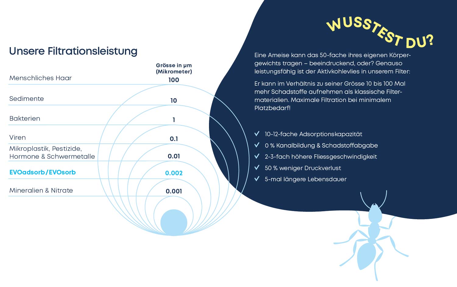 - Filter: Neuartiges Adsorbationsmaterial aus eigener Entwicklung mit einer konstanten Filtrationsleistung bis 2 Nanometer. Dies beinhaltet Schwermetalle, Bakterien, Viren, Mikroplastik, Medikamentenrückstände, Pestizide und Chlor.